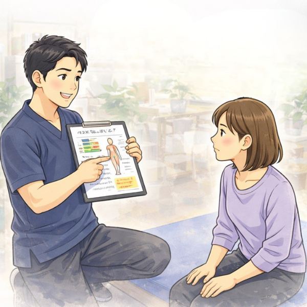 姿勢・動き・呼吸などを確認しながら、今の身体の状態を客観的に整理。